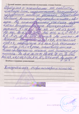 - На второй стороне указывают анамнез, симптомы, результаты анализов, назначенное лечение и его результаты. Также прописывают состояние пациента к моменту выписки.