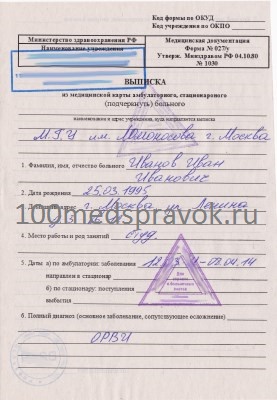 Справка 027 у – это ничто иное, как выписка из карты больного. Документ подтверждает пребывание пациента в стационаре в том или ином медицинском учреждении. Справка о болезни содержит данные о названии больницы, длительности лечения, диагнозе, осложнениях. Получить справку можно в любом медицинском учреждении – поликлинике, больнице, госпитале, диспансере и других.